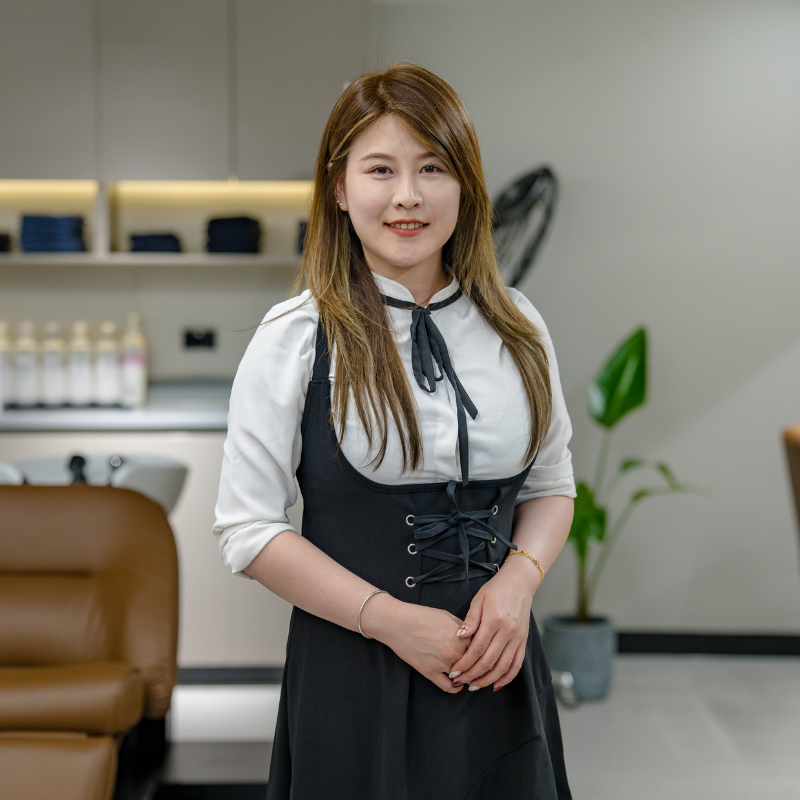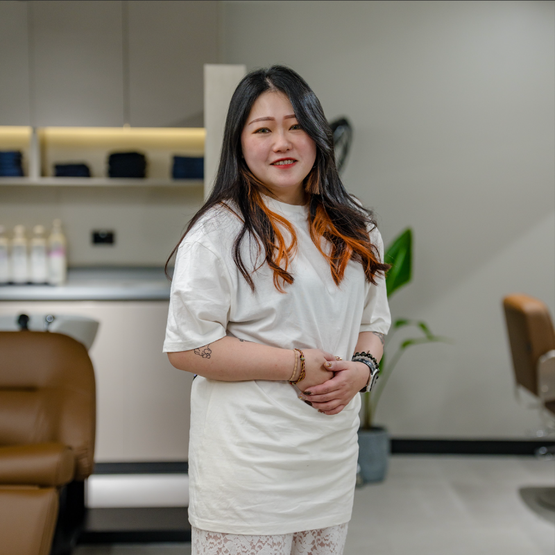 Expert in cutting, styling, and colour design. Outside the salon, she enjoys watching dramas, shopping, and fishing — bringing both creativity and calm focus into her work.